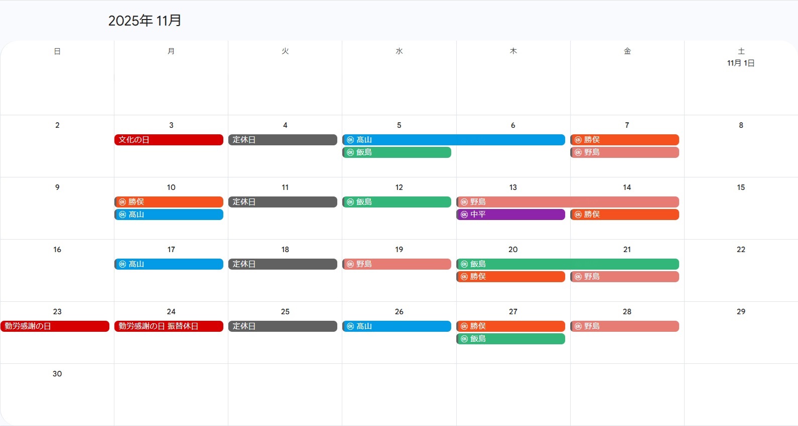 【11月のお休み】