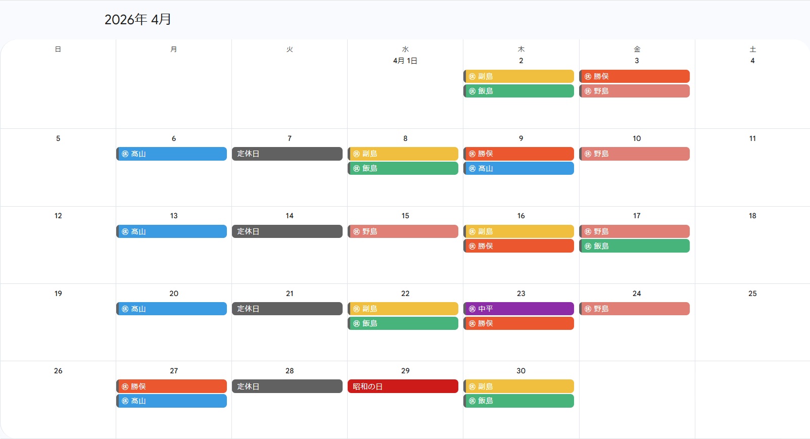 副島/5日(火・祝)・13日(水)・20日(水)・25日(月)・27日(水)、
