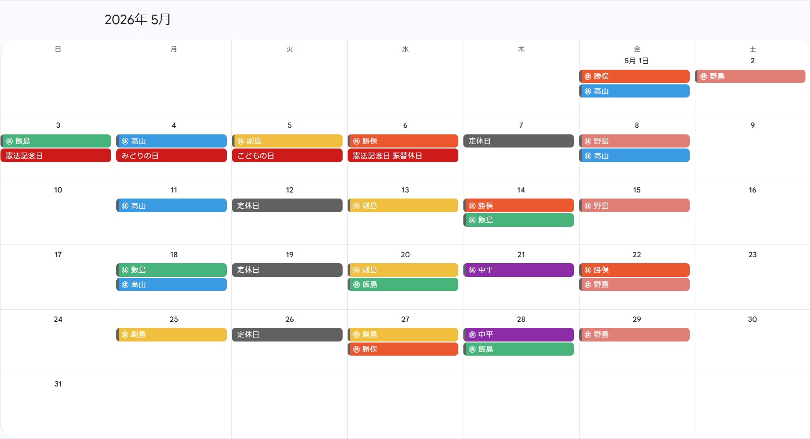 勝俣/1日(金)・6日(水・祝)・14日(木)・22日(金)・27日(水)、